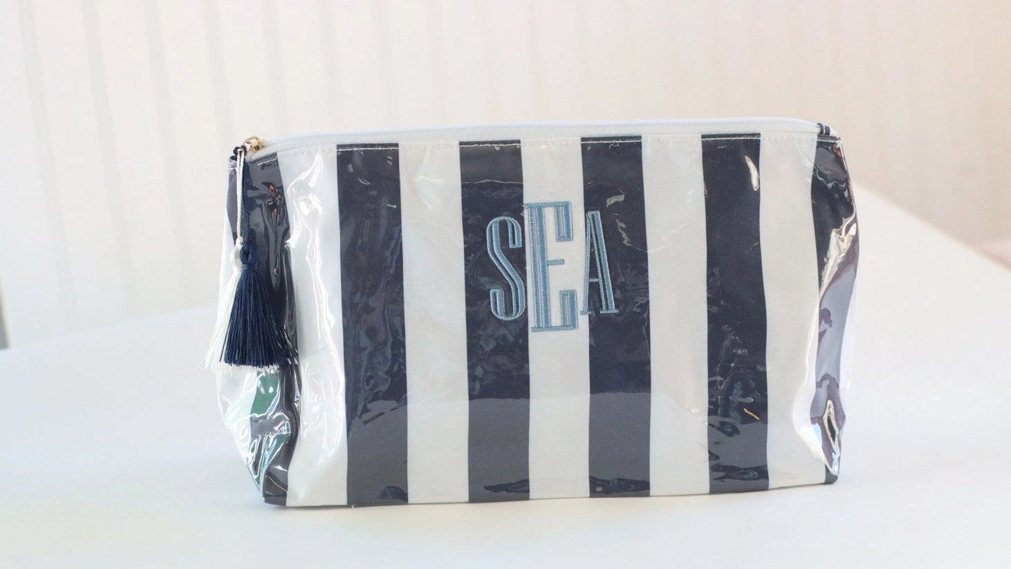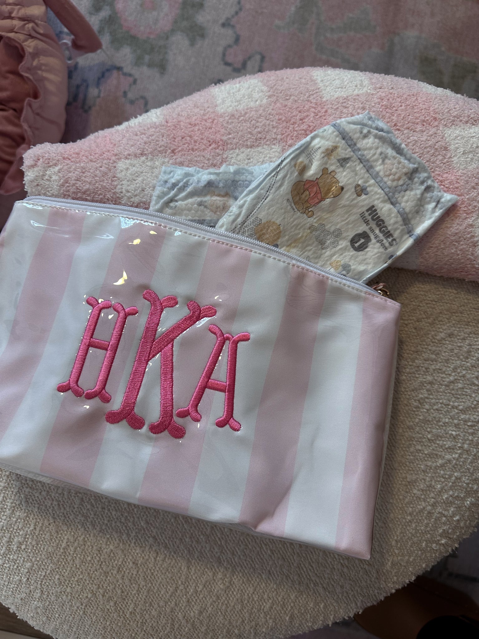 - Font: Please let us know if you'd like the font that is on the pink bag or the font showing on the navy bag.